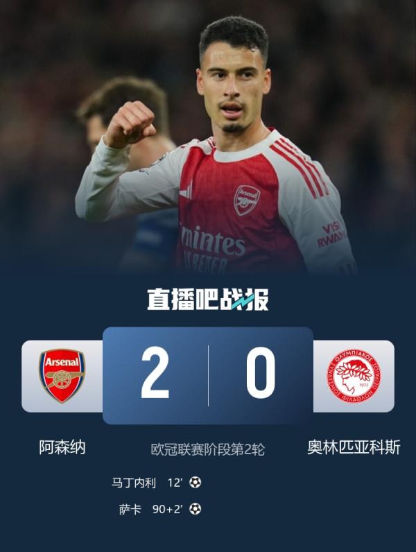 阿森纳本轮2-0击败奥林匹亚科斯,马丁内利、萨卡各入一球,小队长厄德高表现出色。