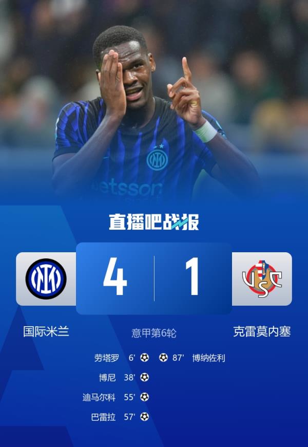 博尼1射3传!劳塔罗、迪马尔科、巴雷拉破门;国米联赛3连胜暂升第4,各赛事取5连胜。