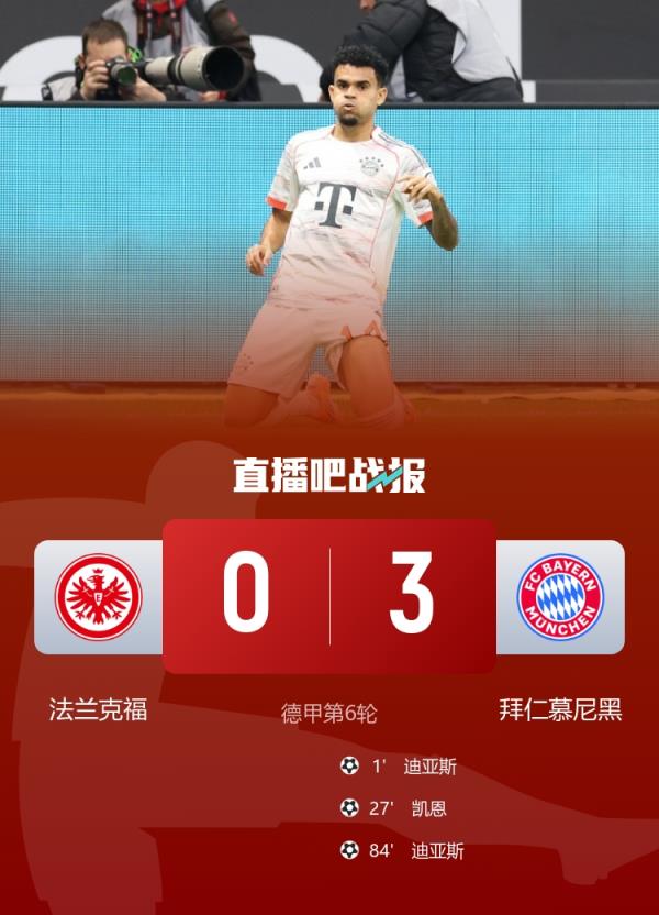 拜仁3-0完胜法兰克福,迪亚斯开场14秒闪击。本场过后,迪亚斯新赛季各赛事10场6球4助攻!