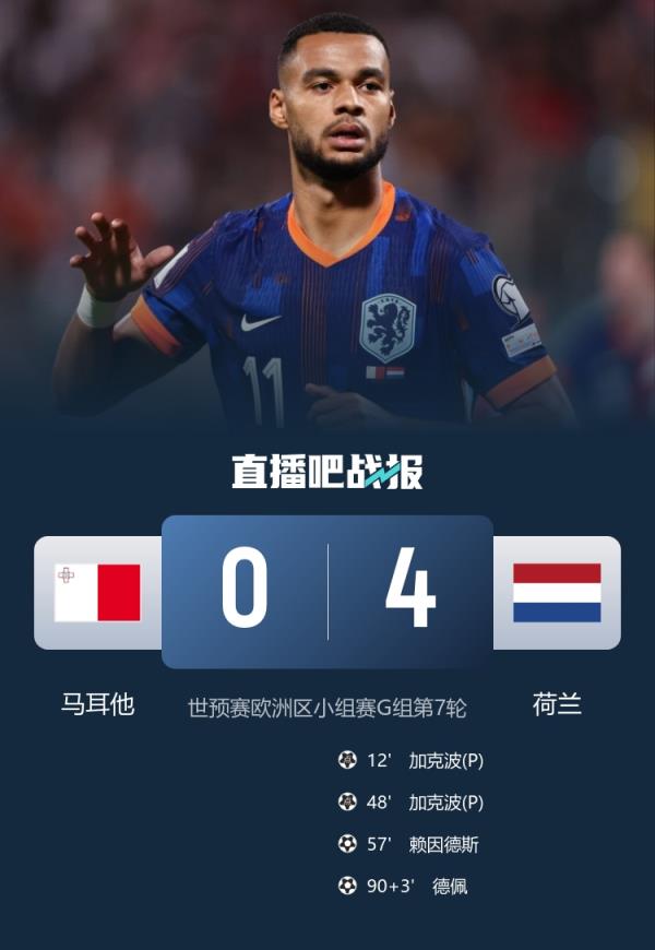 上半场赫拉芬贝赫造点,加克波点射闪击得手,下半场加克波点射完成双响,赖因德斯推射扩大比分,德佩替补建功,最终荷兰4-0马耳他三分领跑。