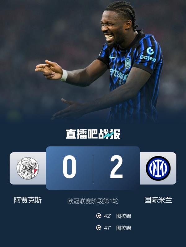 国米2-0阿贾克斯取欧冠开门红 小图拉姆双响恰尔汗奥卢两助攻