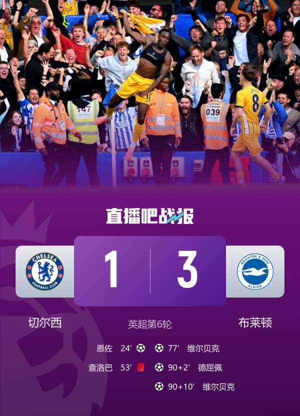 英超第6轮,十人切尔西1-3布莱顿,遭遇两连败,查洛巴红牌。