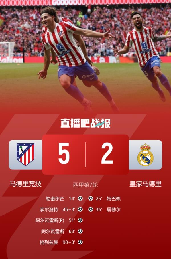 皇马首败!马竞5-2大胜皇马 阿尔瓦雷斯双响格子建功姆巴佩破门