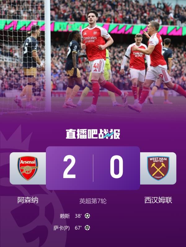 赖斯破旧主+伤退,萨卡英超200场里程碑建功,枪手先赛1分优势暂登英超榜首。