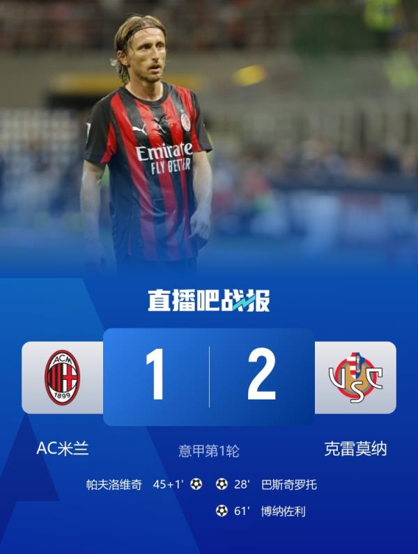 意甲联赛第1轮,AC米兰1-2不敌克雷莫纳,博纳佐利倒钩制胜。